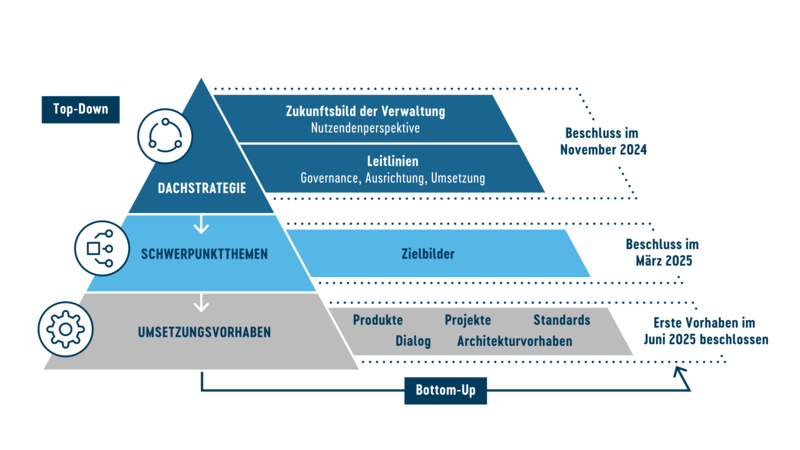 - Die Dachstrategie legt die gesamtstrategische Ausrichtung fest. Sie beinhaltet ein Zukunftsbild der Verwaltung sowie die Leitlinien, die die Rahmensetzung für eine Umsetzung geben.